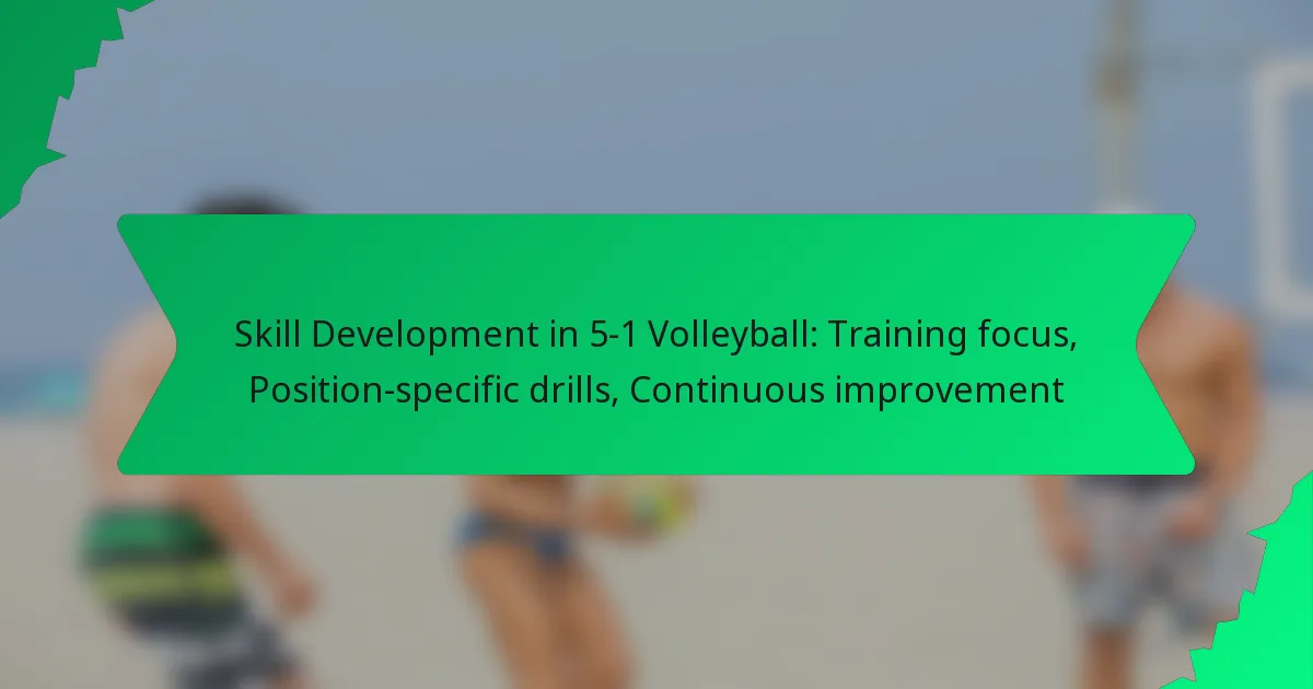 Players can enhance their skills in a 5-1 volleyball system by focusing on position-specific drills tailored to their roles. These drills not only refine individual techniques but also promote teamwork and game understanding, leading to continuous improvement on the court.